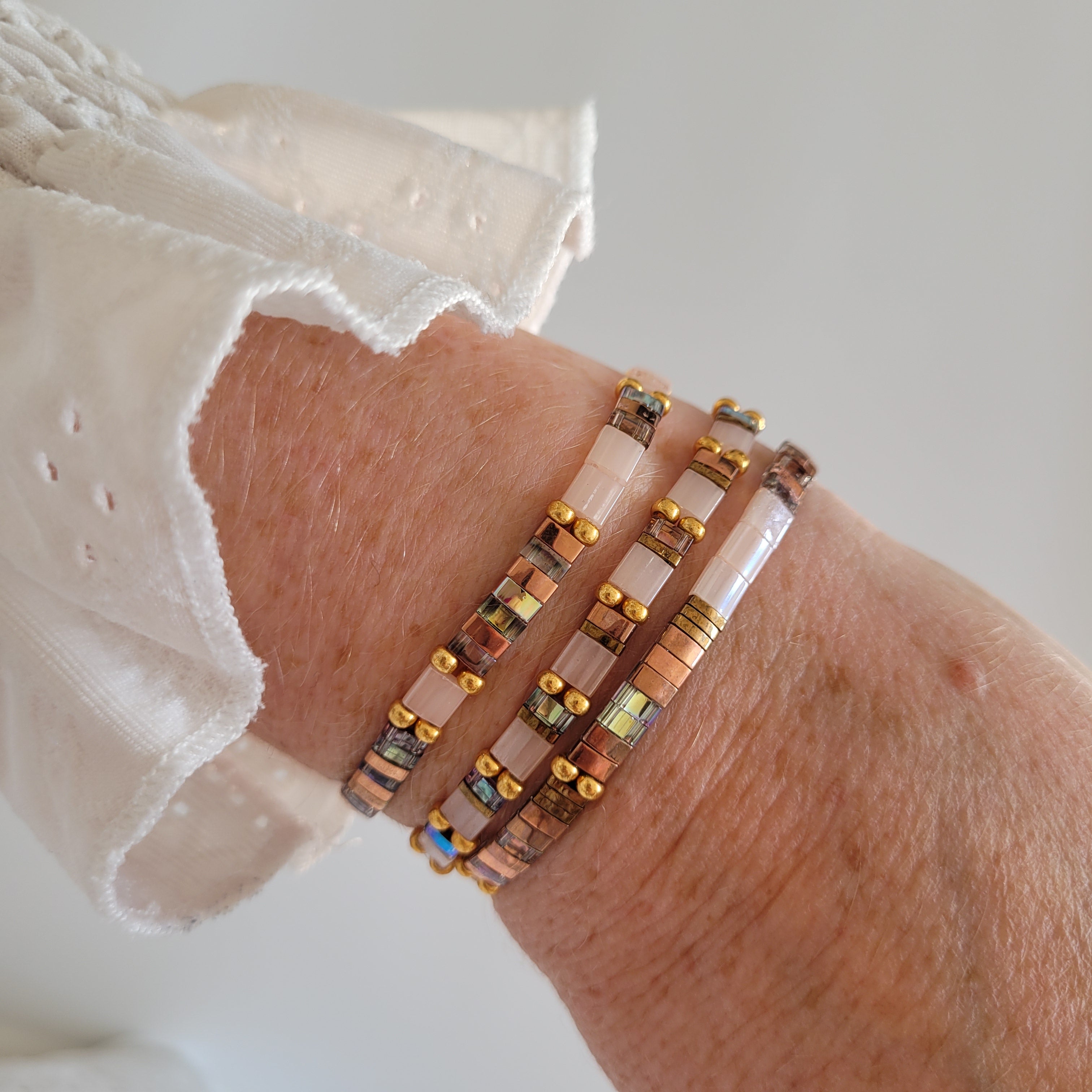 Découvrez notre collection de bracelets tissés Maroussia Miyuki, une ode à la finesse et au savoir-faire artisanal. Chaque pièce est minutieusement confectionnée à la main avec des perles de verre japonaises d'une qualité exceptionnelle, connue pour leurs formes géométriques uniques et leurs reflets délicats.
