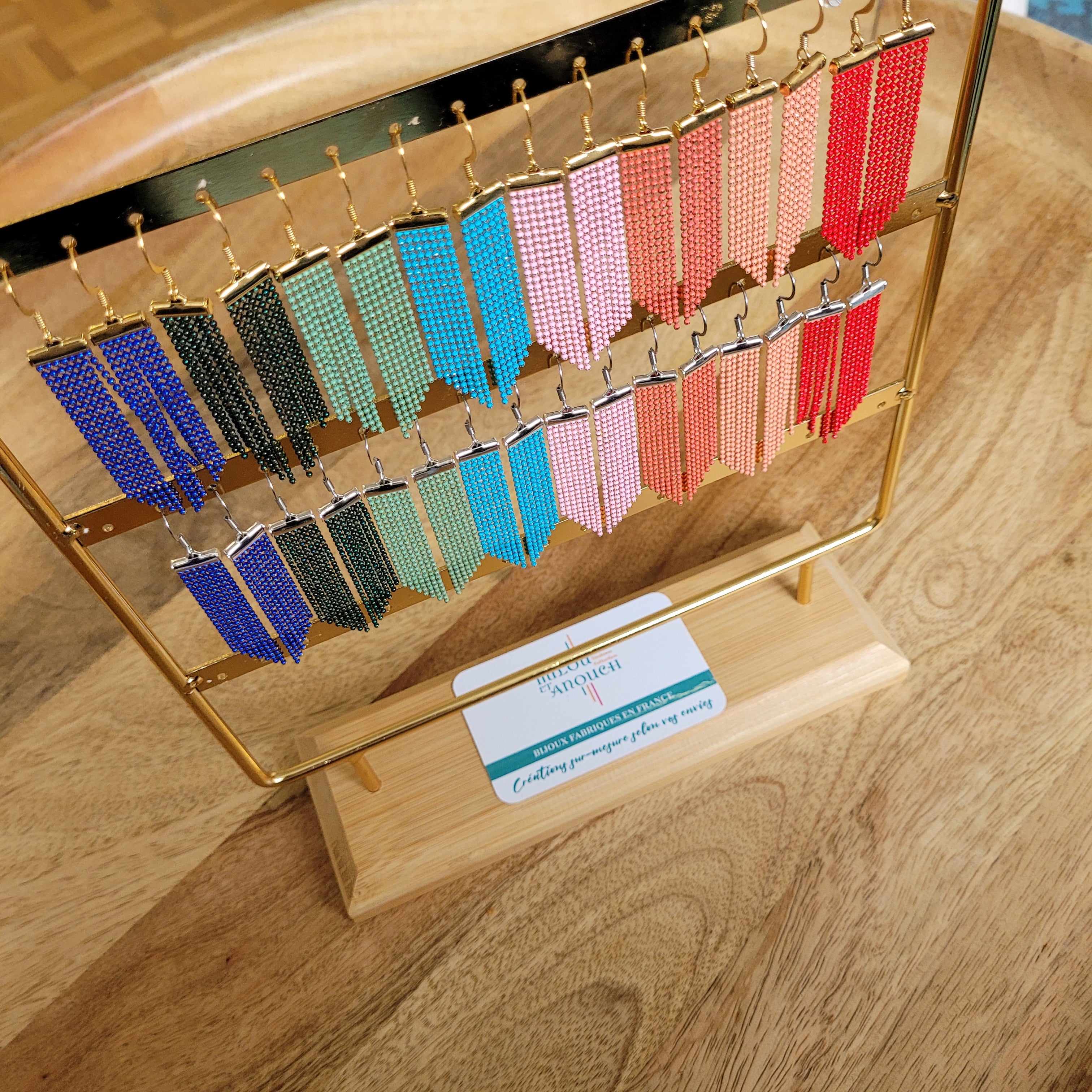 Nous proposons des bijoux fabriqués avec des perles de verre, des perles en acrylique ou des pierres naturelles. Les crochets d'oreilles, les anneaux, les systèmes de fermoirs sont soit en laiton doré à l'or fin soit en acier inoxydable. Si vous présentez des allergies spécifiques, n'hésitez pas à nous contacter pour des recommandations.