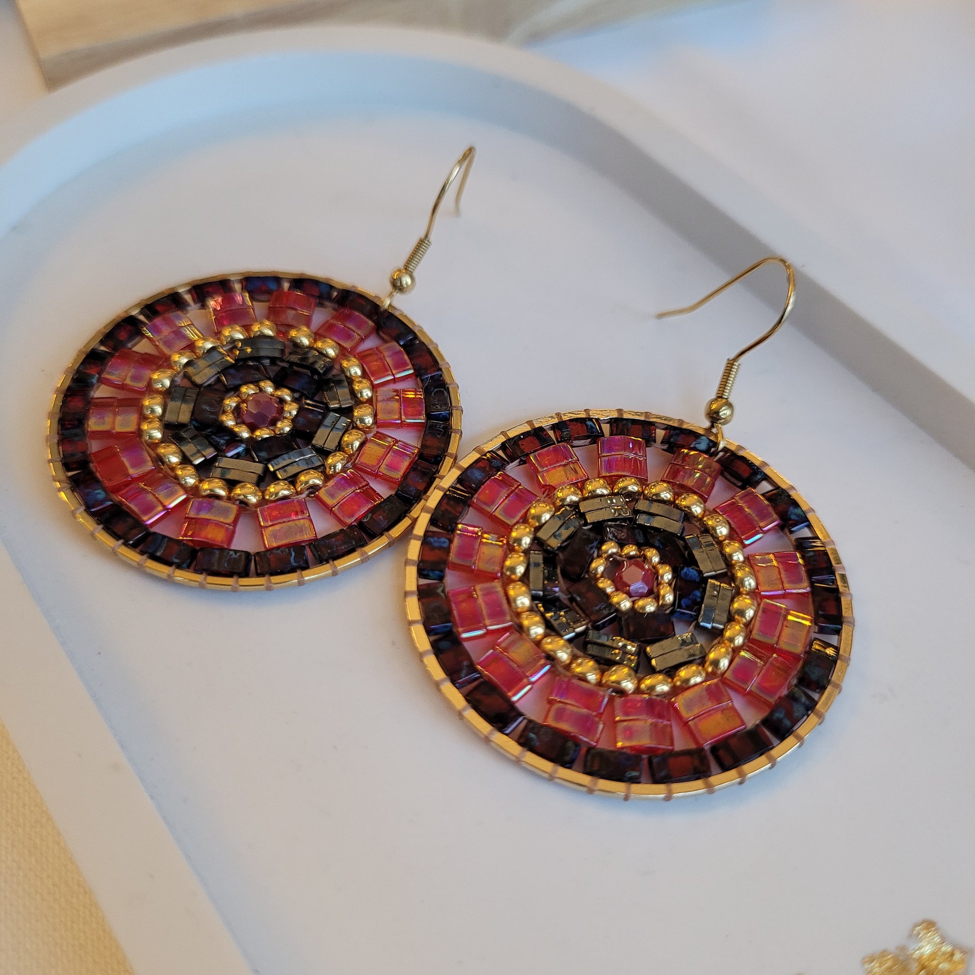 Boucles d'oreilles brodées avec des perles Miyuki Tila autour d'un anneau. Réalisable sur commande dans d'autres coloris. Utilisez le formulaire de contact pour nous faire parvenir toutes vos demandes !